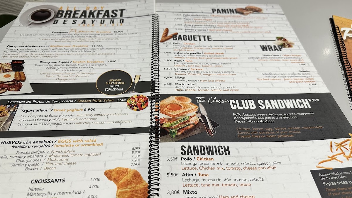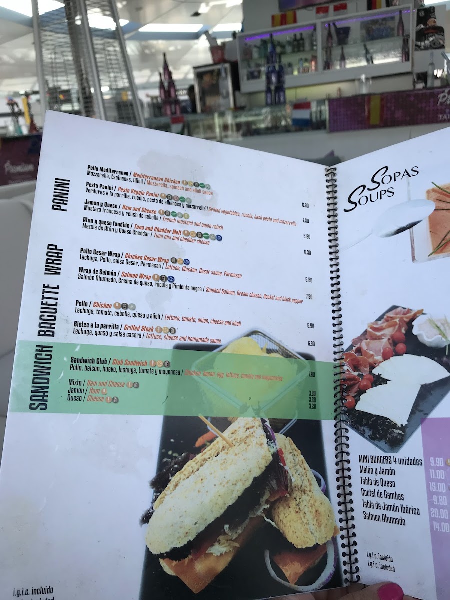 Food offerings include pizzas, sandwiches, and various light bites. Typical choices cover items like club sandwiches, dishes with ham and cheese, and egg-based preparations. The menu also features tapas-style options, salads, and snack items that are appropriate for quick orders or more relaxed meals.